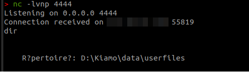 Nous recevons ensuite une connexion depuis le serveur et parvenons Ă obtenir un shell fonctionnel sur la machine :