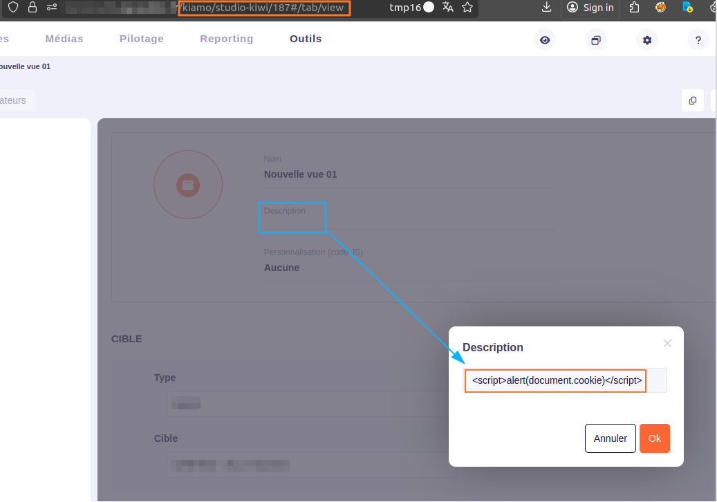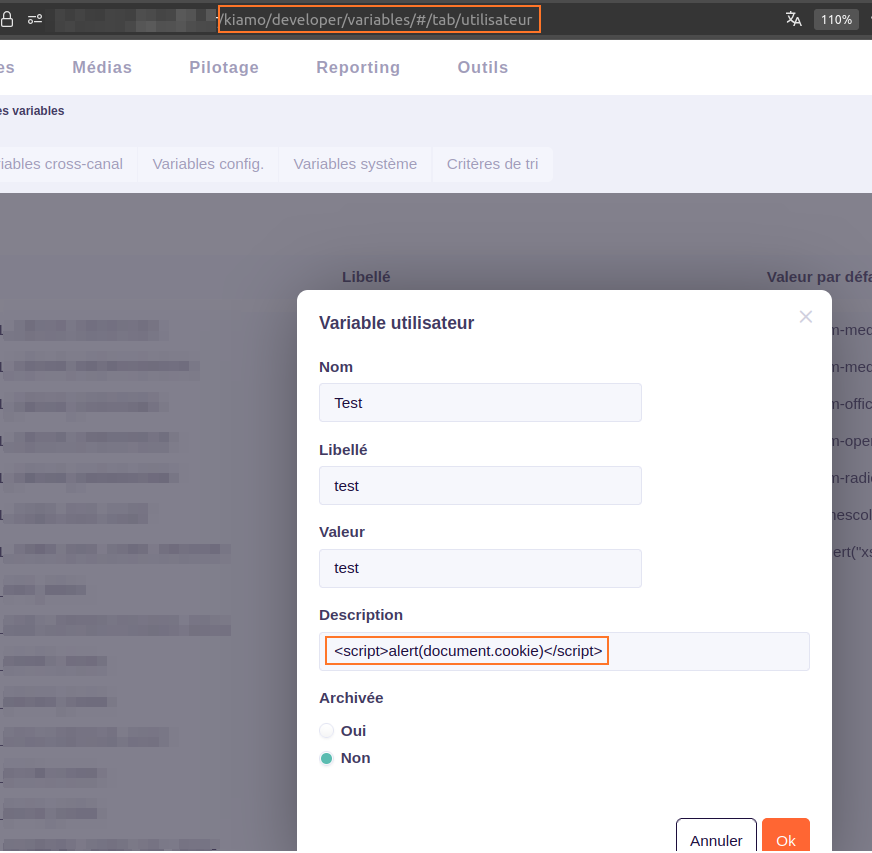 D’autre part, dans la section /kiamo/developer/variables/#/tab/utilisateur, nous constatons que le champ « description » de la variable utilisateur est vulnérable aux attaques XSS, permettant l’exécution de code JavaScript lors de l’affichage des données :